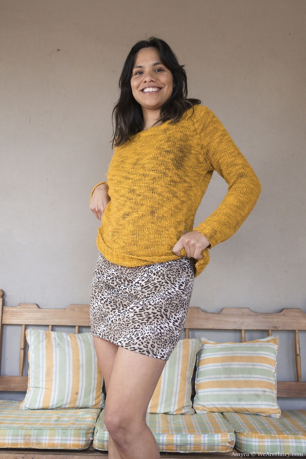 Latina by the name of Amyra has bought a new outfit and boots. She can't wait to come home and brag about it to the boyfriend that actually has given her money for shopping. The woman suddenly begins to undress and the sweetheart immediately takes the camera to take pictures of her hairy armpits and pussy. He is lucky to drill it with a hard cock whenever he wants.